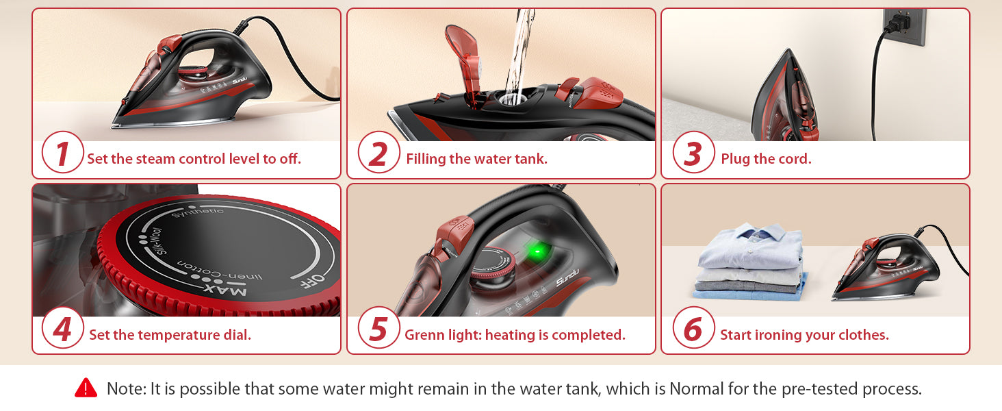 Notice: Each steam iron undergoes rigorous testing to ensure it meets our high-quality standards. Visible water residue is a sign of our commitment to ensuring you receive a fully functional device. We offer 24-hour dedicated customer service, and your satisfaction is always our top priority.