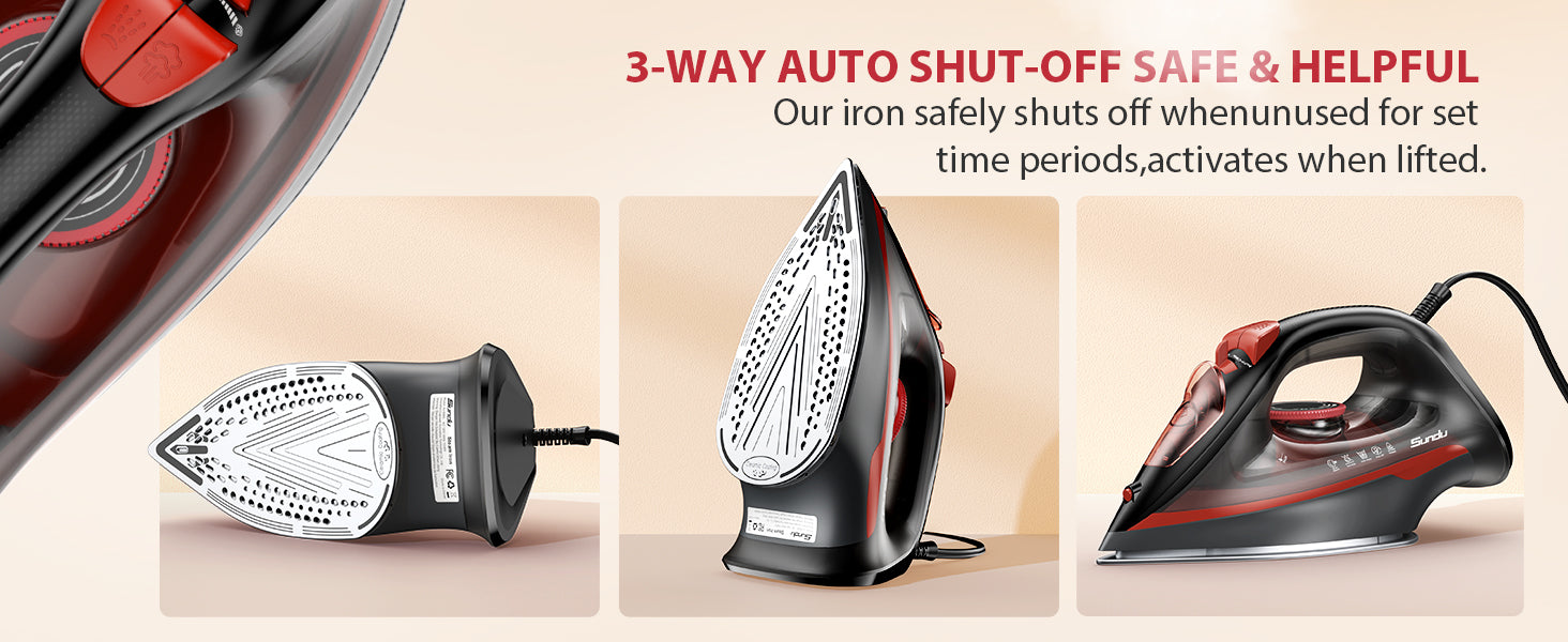 3-Way Auto Shutoff & Shake Activation: Sundu iron for clothes automatically shuts off and alerts you when the iron is left unmoved: horizontally (30 sec); vertically (8 min); tipped sideways (30 sec).simply pick up and shake the device to restore power without needing to unplug it.
